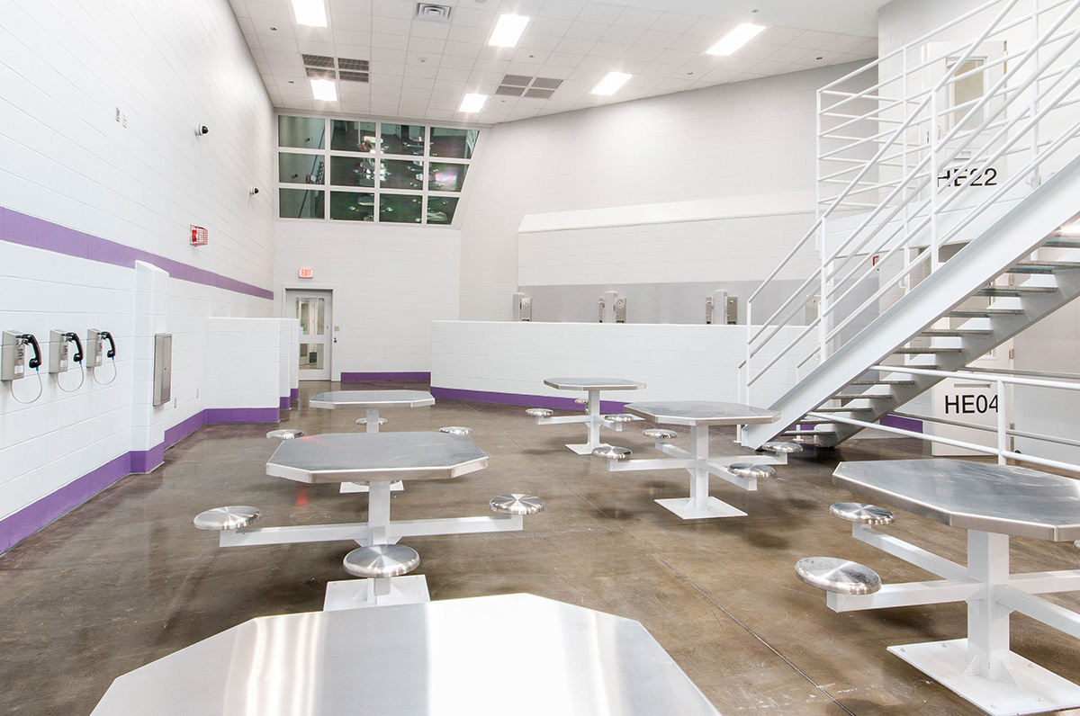 The detention area housing consists of 105 pre-fabricated steel cells stacked 2-stories. Pre-fabrication of cells in a controlled environment allows for better quality control and the ability to expedite schedule. The project team saved an estimated two months of project schedule through the use of pre-fabricated cells and BIM modeling.