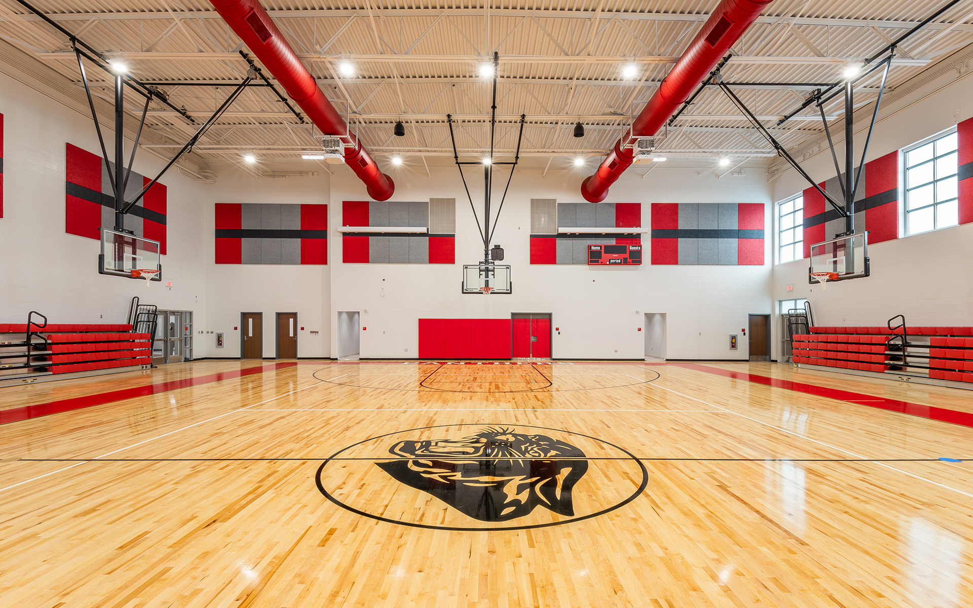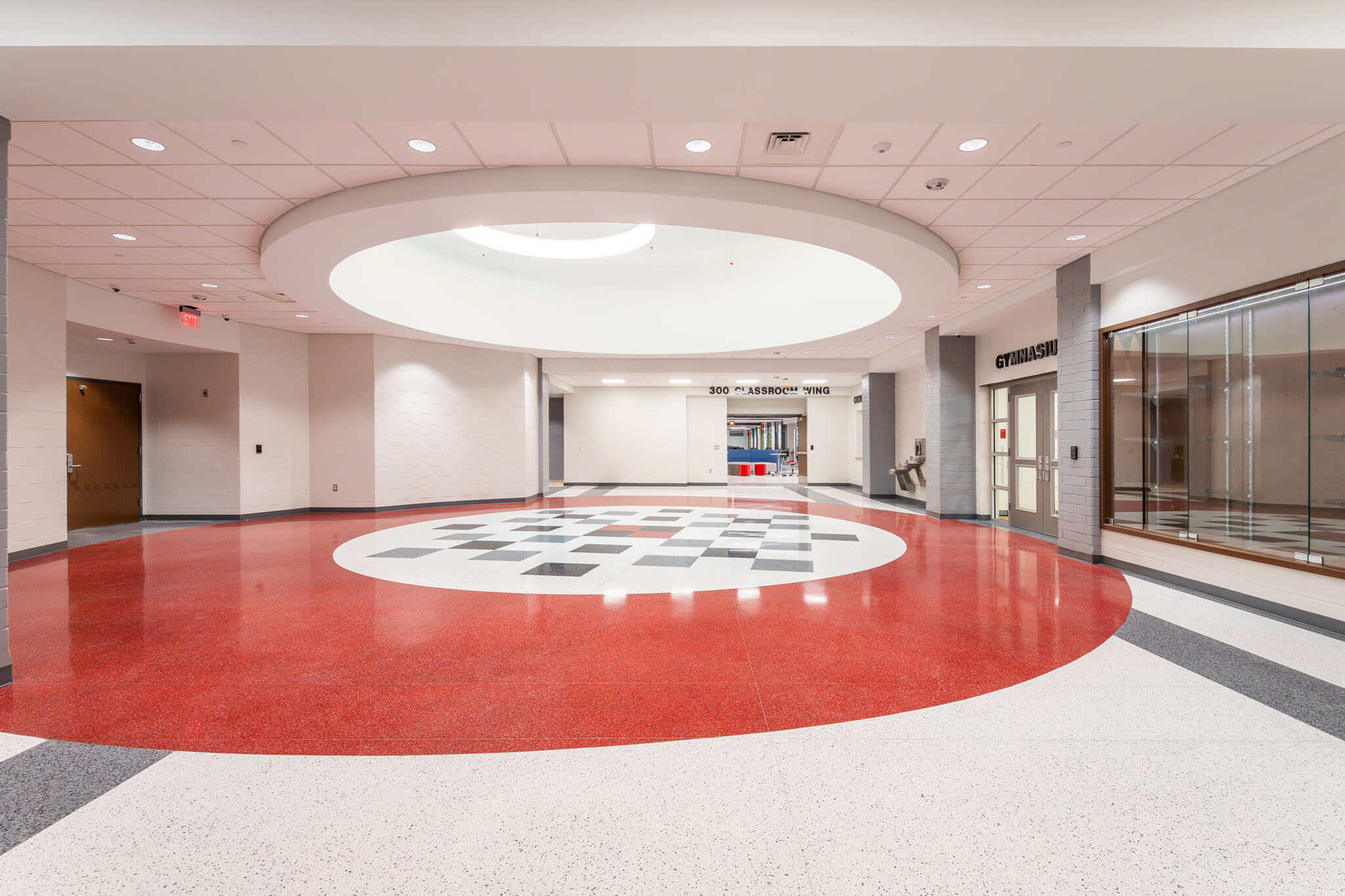 The school features a 780KW solar photovoltaic system, comprised of 1,664 rooftop solar panels, as well as LED lighting throughout the building. The solar PV system is estimated to provide 1,193 MWH/year, which is equivalent to the energy needed to power 110 homes annually. The solar array creates a flatter energy usage curve from the electric utility and significantly reduces the cost of the school’s electric bill. In addition to powering the building, the rooftop solar panels recharge the school’s five electric buses during non-peak hours. After their morning routes, the buses re-connect to the charging stations. The bi-directional bus charging system will then allow the electric buses to offset the school’s peak demand consumption. The school’s HVAC system utilizes a closed-loop geothermal system located underneath the athletic fields. The 140 wells, spaced at 25 feet on center, extend 300 feet into the ground and utilize the constant temperature of the ground, typically 55 degrees, to heat and cool the building.