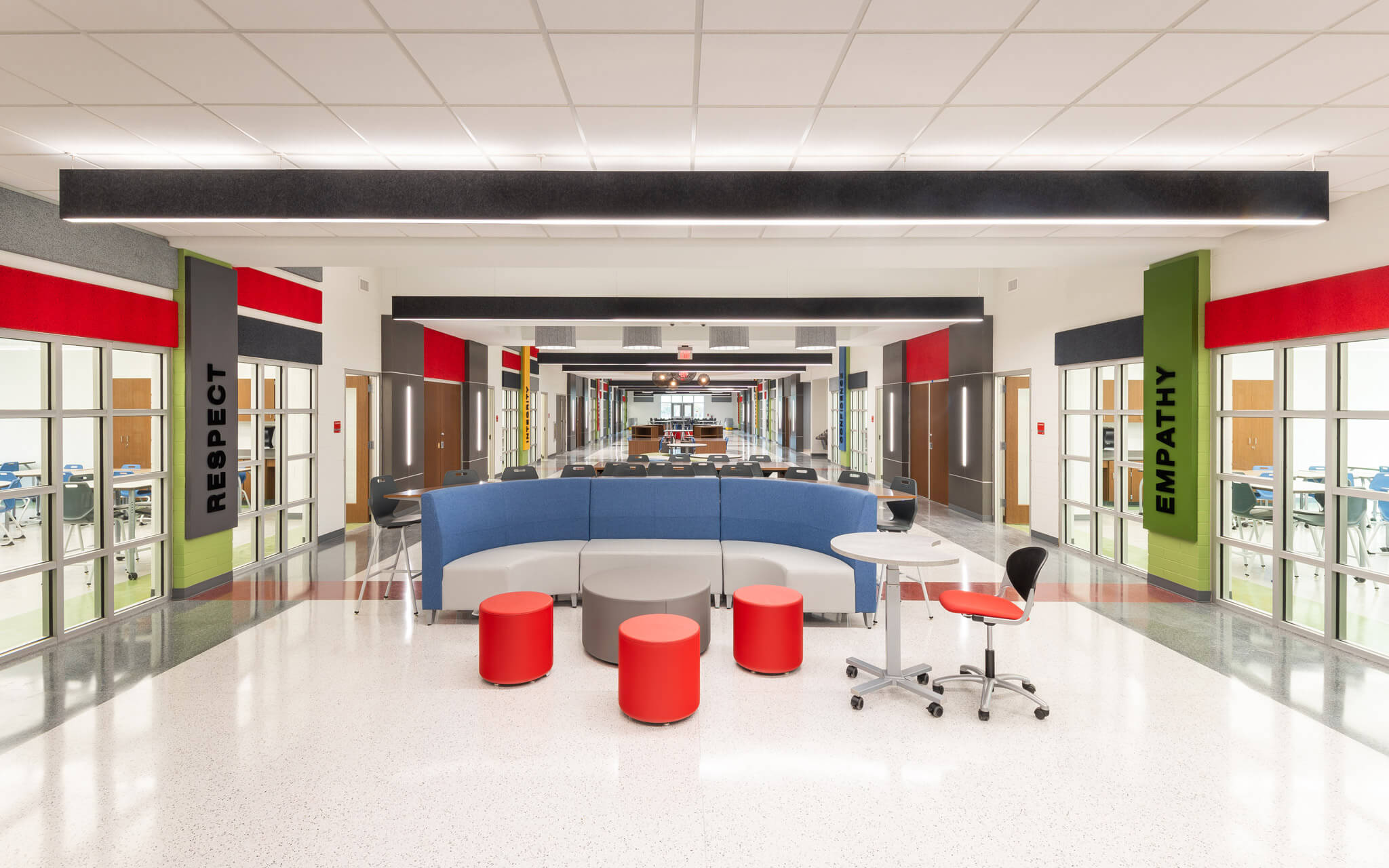 Water source heat pumps were housed in mechanical closets on the classroom wings. Bordeaux Construction used BIM coordination to configure the layout of the heat pumps, piping, hose bib location, and disconnects. Since the closets were small, this coordination needed to be precise. Additionally, the building has spray foam around the exterior perimeter walls, which creates a shell around the school that reduces the thermal transition of temperature. When the building was designed, there was a significant supply shortage of bar joist and deck. To save time and money, the team decided to use precast hollow core. This decision also had sustainable building benefits; hollow core slab ensures that classroom temperatures do not drift more than one degree during the weekends when the school is not in use.