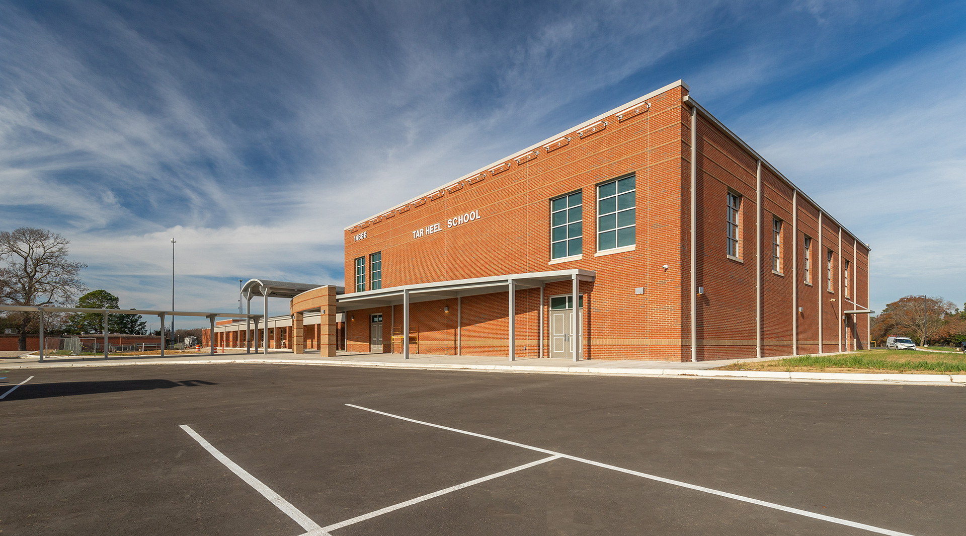 The Tar Heel School has served the community of Tar Heel for nearly a century. Built on the site of the historic school, the new school is centrally located in the community. It is an approximately 87,000 SF, one-story building that features load-bearing masonry walls and brick veneer, with structural joists and cold-formed metal trusses. From its modest beginnings in 1925 as a building with no electricity or air conditioning, the Tar Heel PK-8 School has been transformed into a state-of-the-art beacon of innovation and efficiency. The school is a Net-Zero Energy building, meaning that the on-site renewable energy measures are capable of meeting or exceeding the school’s annual energy consumption needs.